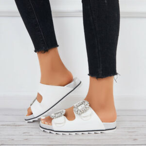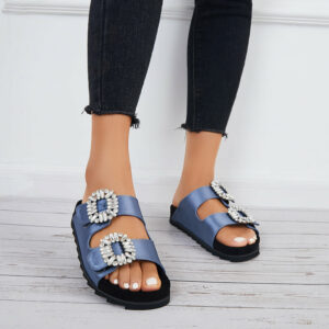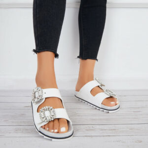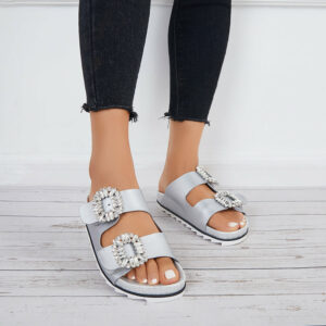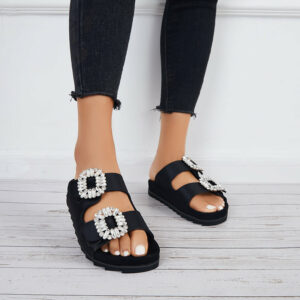 Double velcro straps slide sandals design with rhinestone buckle decor can be adjusted to your best fit, feature a popular silhouette that looks great with all kinds of outfits.